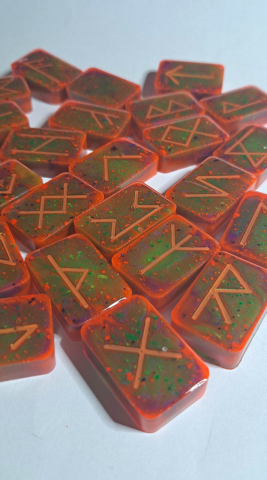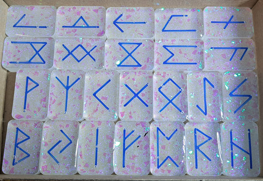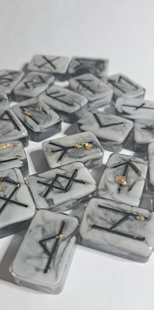 Tyypillinen riimusetti koostuu 24 symbolista muinaisesta pohjoismaisesta aakkosesta, jotka on usein valmistettu materiaaleista, kuten puusta, kivistä, lasista tai jopa hartsistakin.