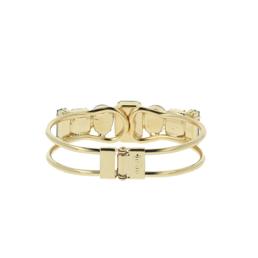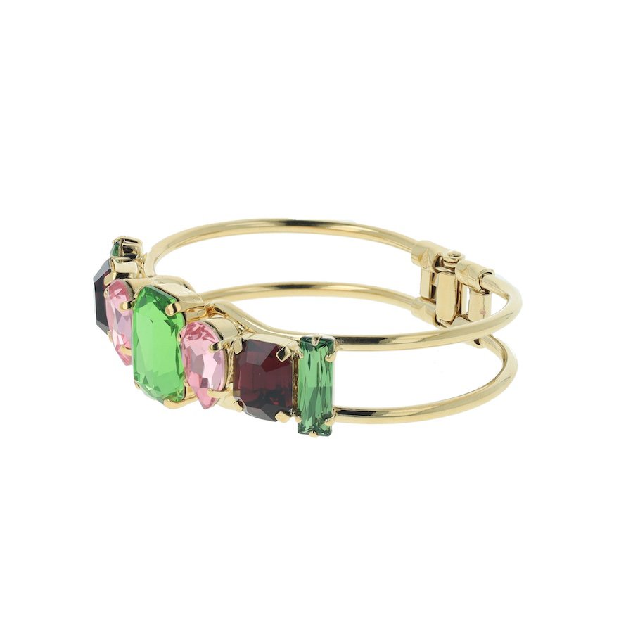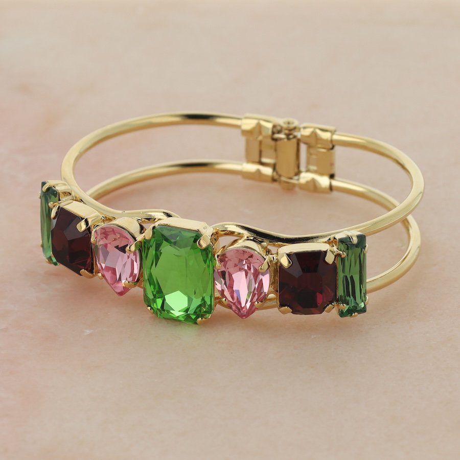 Tämä upea ranneke on koristeltu erimuotoisilla kristalleilla ja viimeistelty 24 karaatin kultauksella. Täydennä tyylisi yhteensopivilla korvakoruilla tai sormuksella!