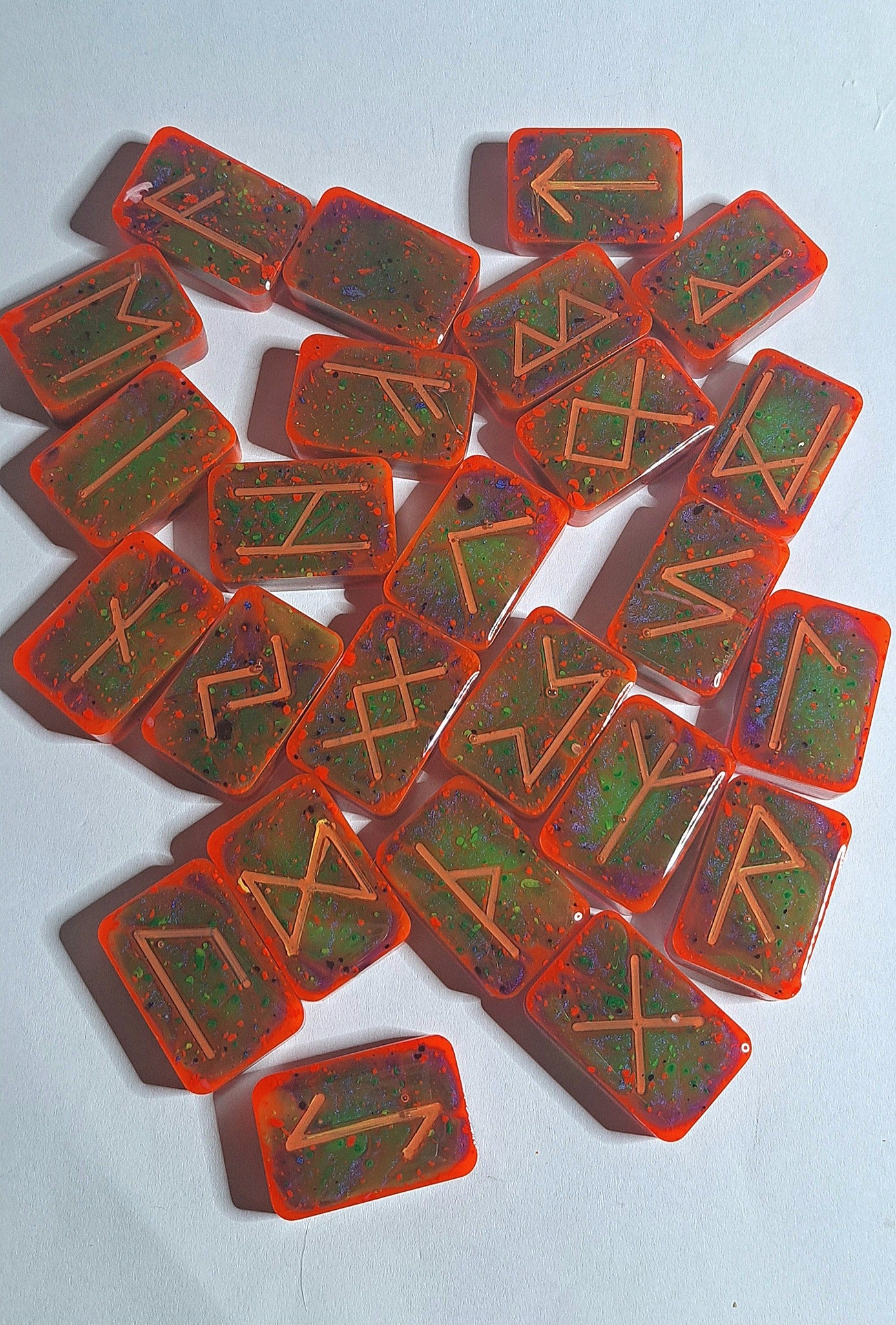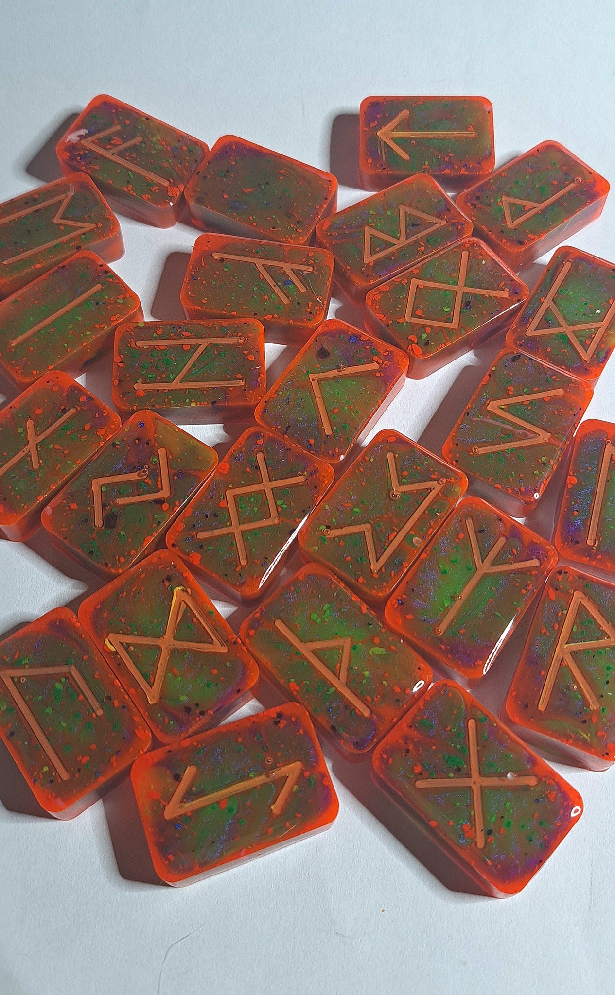 Nämä riimut on valmistettu epoksista, joiden sekaan on intuitiivisesti lisätty omanlaisensa kädenjälki ja sävyineen luotu omanlainen merkityksensä. Jokainen riimu on yksilöllinen, eikä toista vastaavaa löydy muualta.