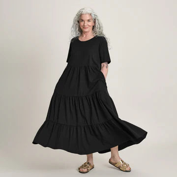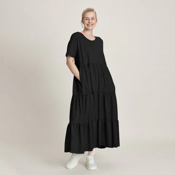 Frillamekko on kevyt ja hurmaava - täydellinen vaate hetkiin, joissa helmat saavat hulmuta ja askel keventyä! Yläosa on kevyesti vartaloa myötäilevä, ja vyötäröltä alkava frilla tuo mekkoon ilmavuutta. Frillamekossa on t-paitahihat, pyöreä pääntie ja tottakai, käytännölliset taskut molemmilla puolilla sivusaumassa. Maksimittainen helma peittää sääret ja liikkuu kauniisti pyörähdellessä. Valmistettu kevyestä ja ohuesta puuvillamodaalineuloksesta.