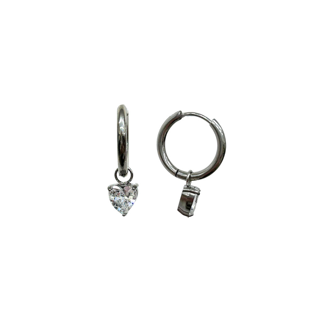 Upeat ja säihkyvät roikkuvat korvakorut, jossa sydämenmuotoinen kirkas kivi. Korvakoruissa saranalukitus.