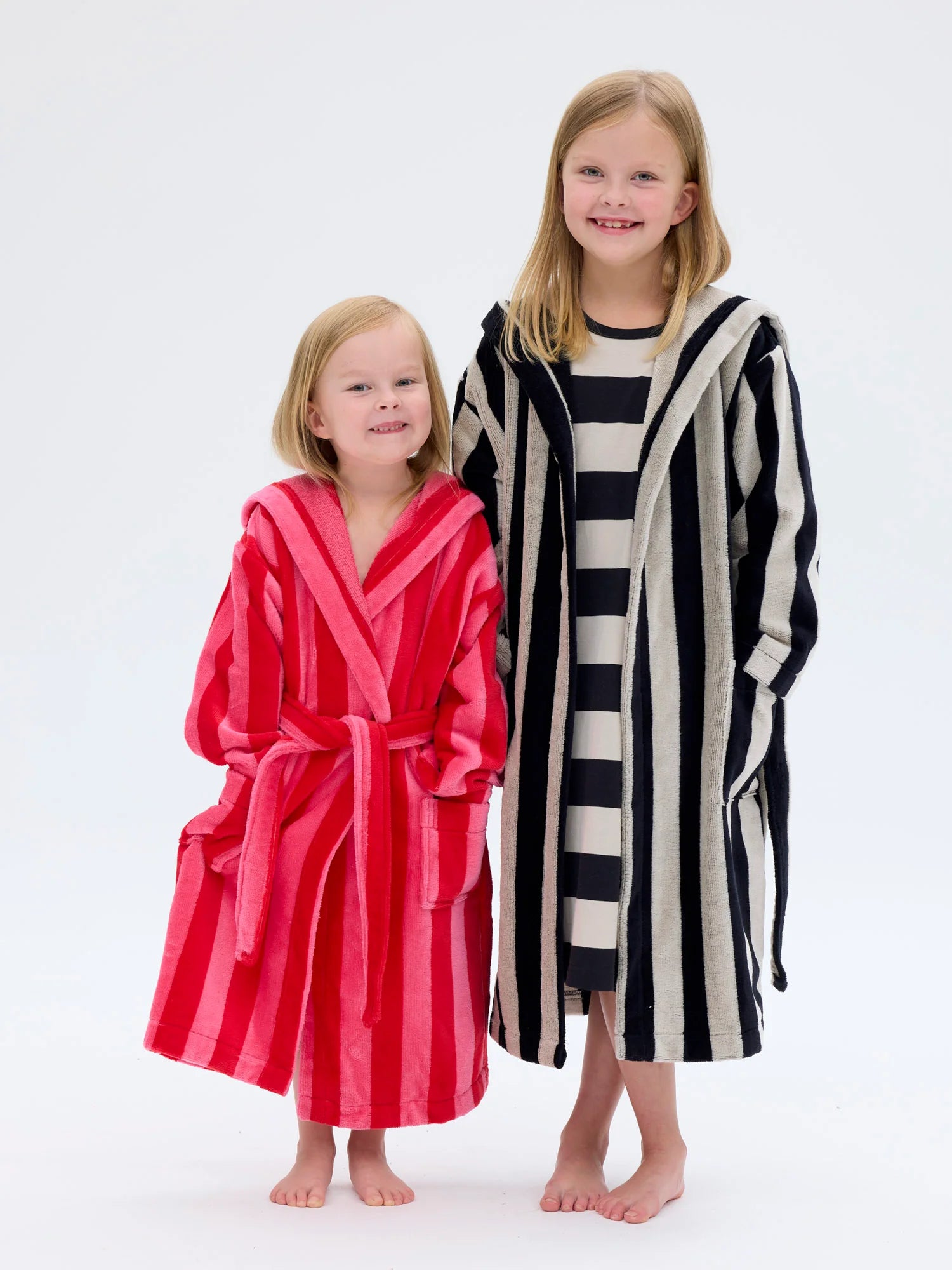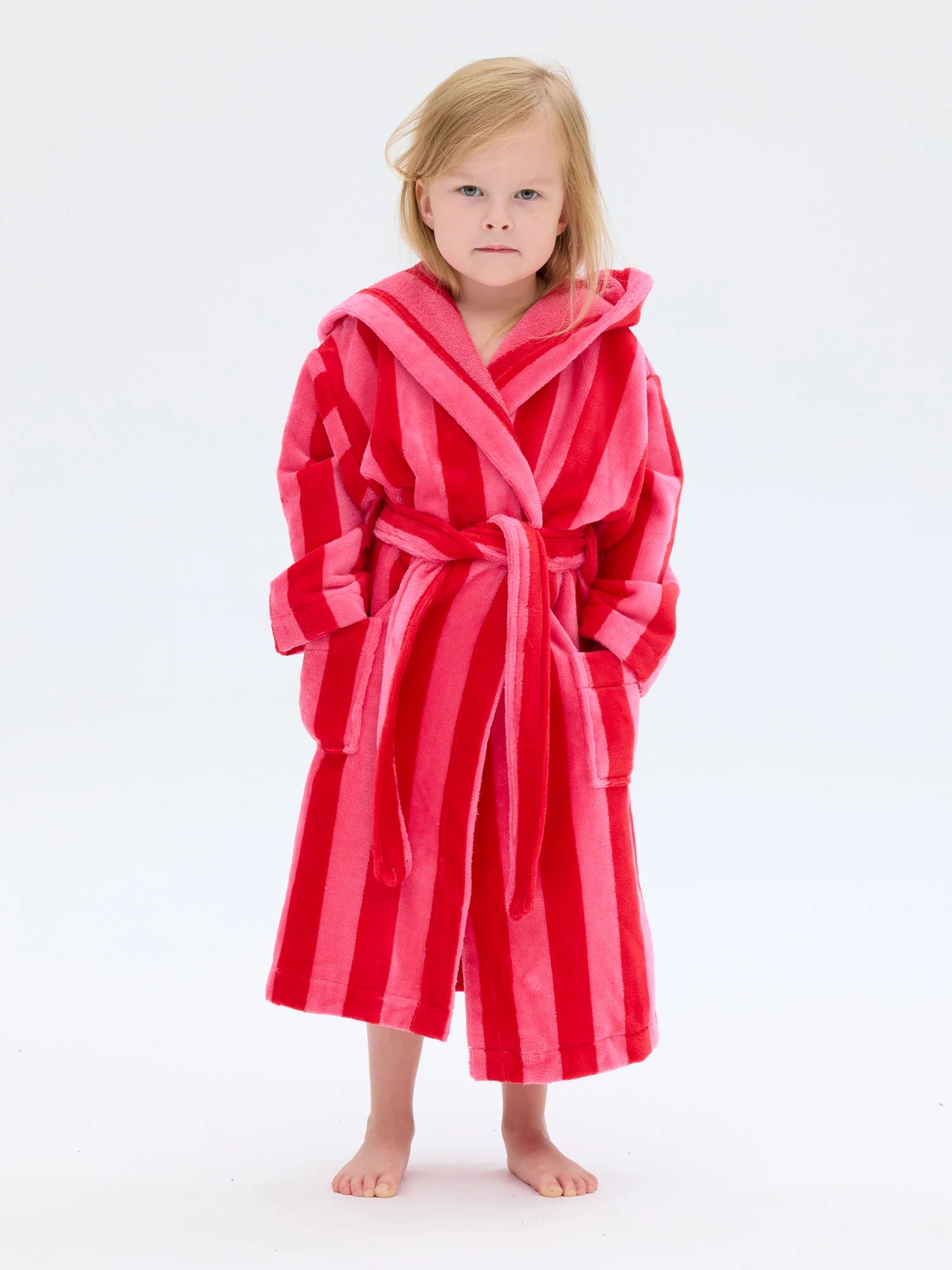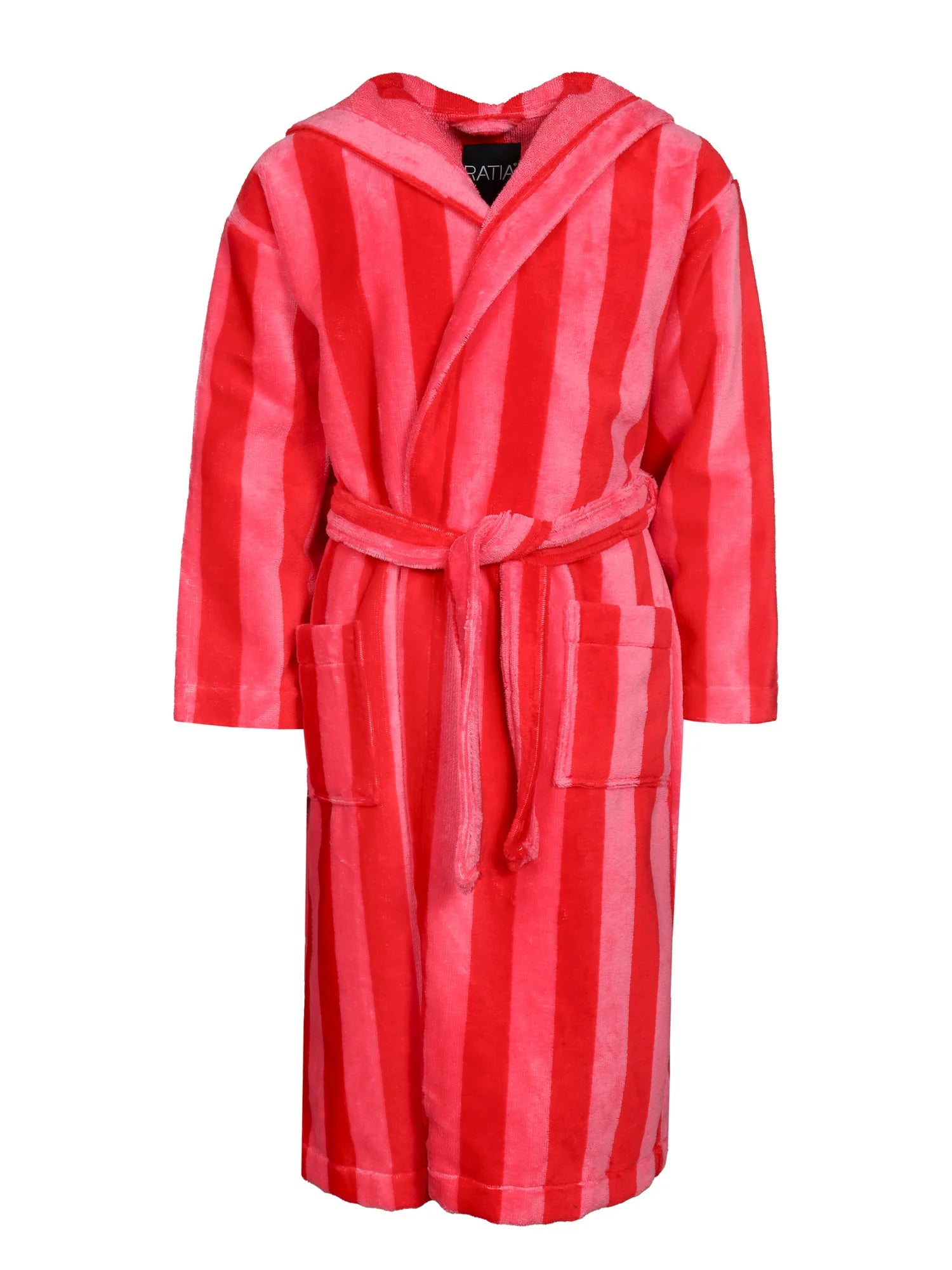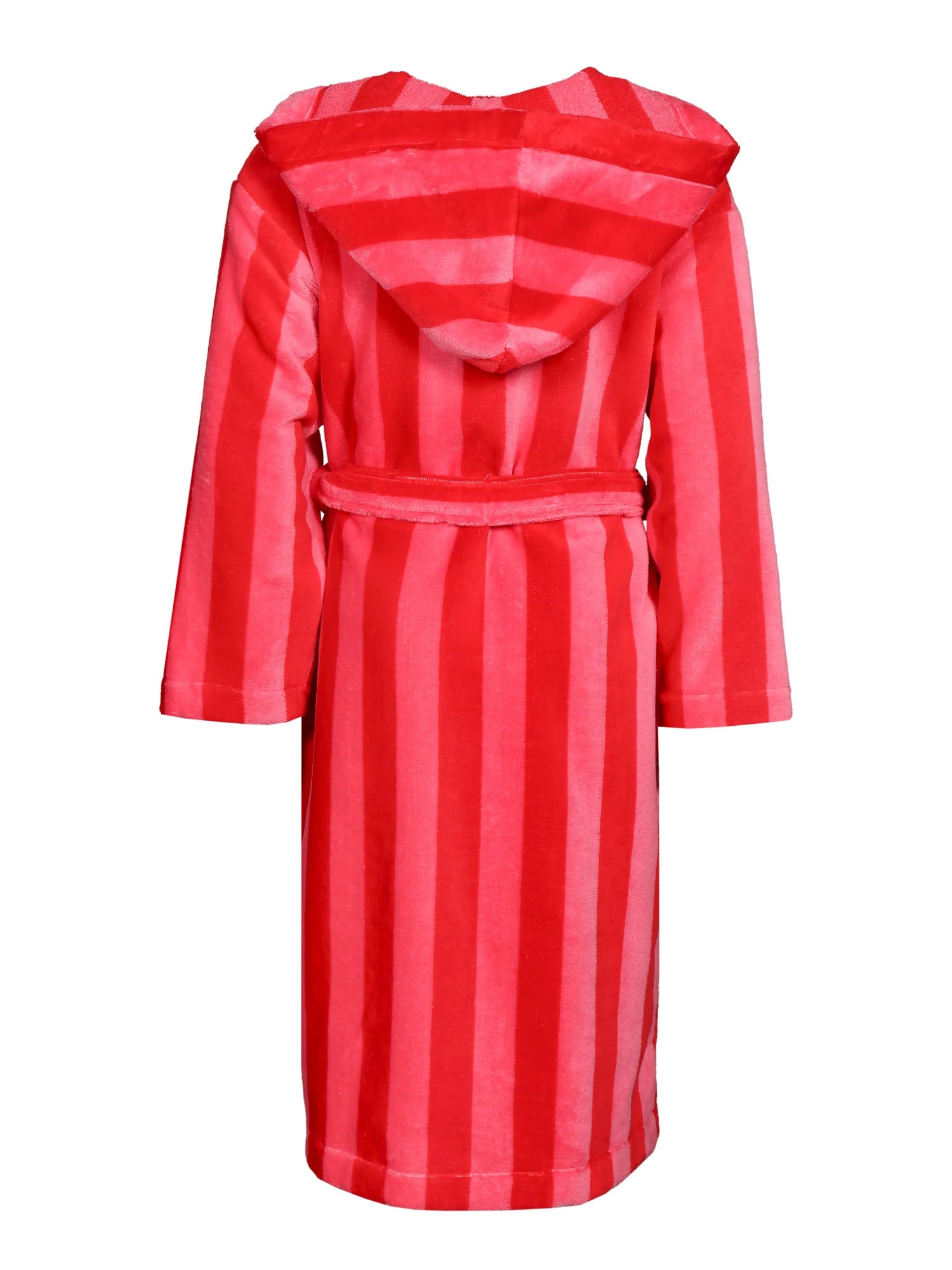 Pirteä kylpytakki raikkaassa puna-pinkki raidassa. Kylpytakin ulkopinta on pehmeää velouria, ja sisäpinta imukykyistä froteeta. Tähän lämpimään kylpytakkiin on mukava kietoutua saunan tai suihkun jälkeen. Raidan leveys on 35 x 35 mm. Kylpytakissa on huppu, taskut ja vyö. Valmistettu Portugalissa.