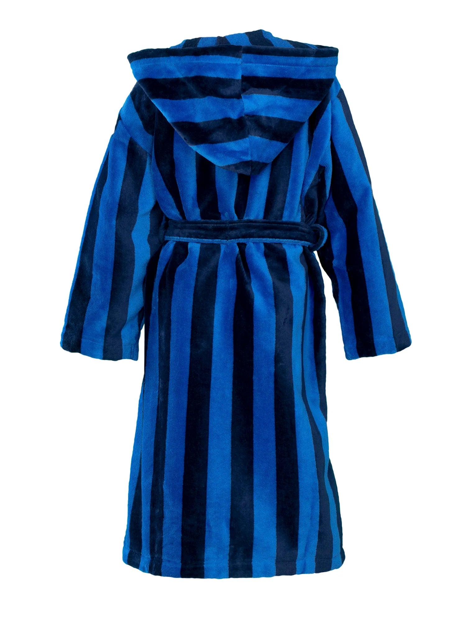 Lasten hupullinen velourkylpytakki kauniissa sinisessä raidassa. Kylpytakin ulkopinta on pehmeää velouria, ja sisäpinta imukykyistä froteeta. Tähän lämpimään kylpytakkiin on mukava kietoutua saunan tai suihkun jälkeen. Raidan leveys on 35 x 35 mm. Kylpytakissa on huppu, taskut ja vyö. Valmistettu Portugalissa. Koot 130-160 cm.