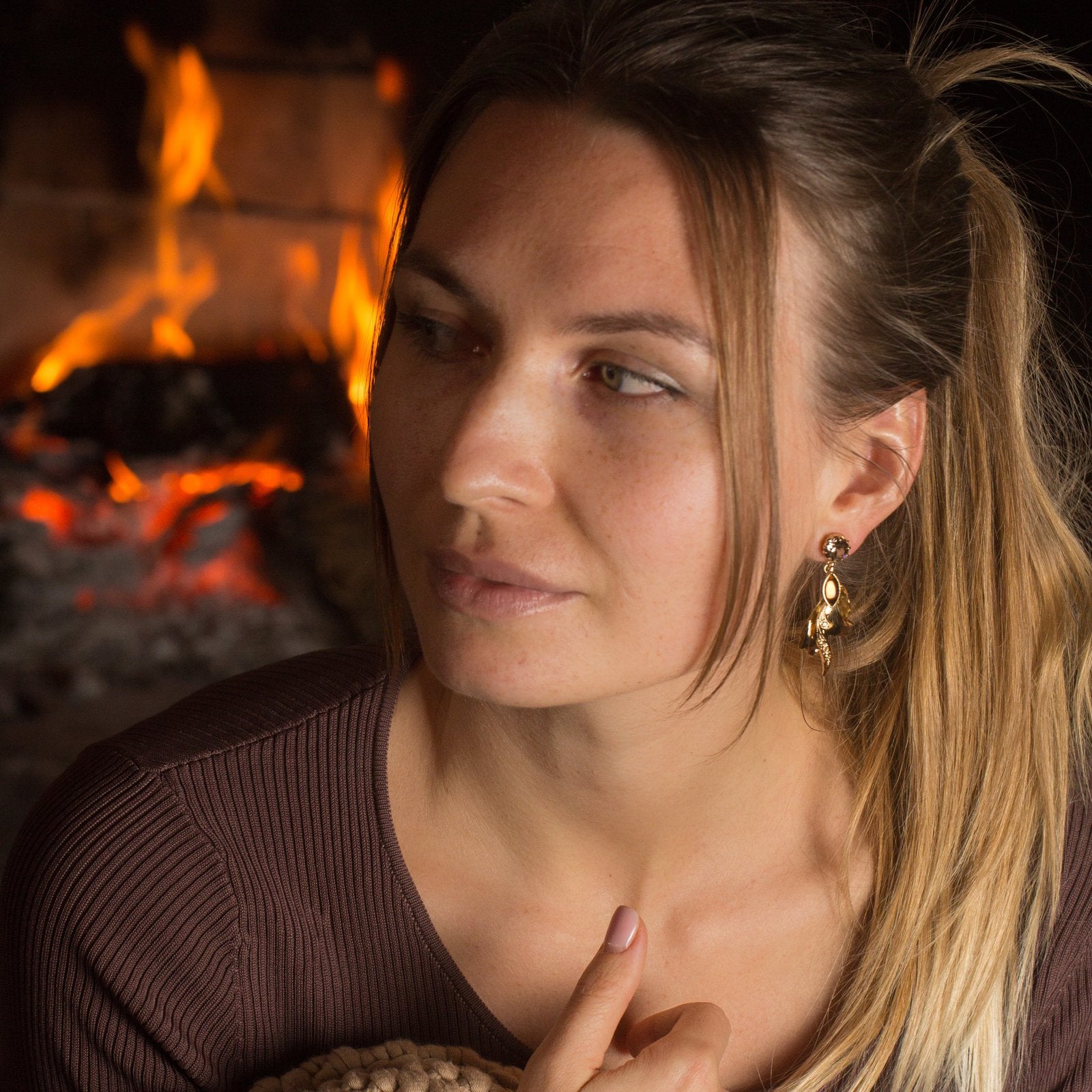 Nämä kultaiset korvakorut on koristeltu soikealla hionnalla varustetulla vaalealla Colorado Topaz -kristallilla sekä pyöreillä mustilla timanteilla ja kirkkailla Swarovski-kristalleilla.
