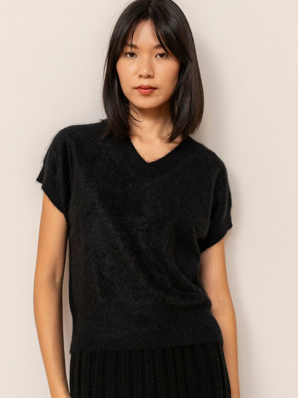 Harjatusta kashmirista ja lyhythihaisesta materiaalista valmistettu Melissa-neulepusero tulkitsee neuleet uudelleen hienostuneella otteella. Sen pehmeä ja pörröinen rakenne yhdistyy mustaan väriin luoden hienostuneen ja tyylikkään neuleen, joka sopii erinomaisesti moderniin vaatekaappiin.