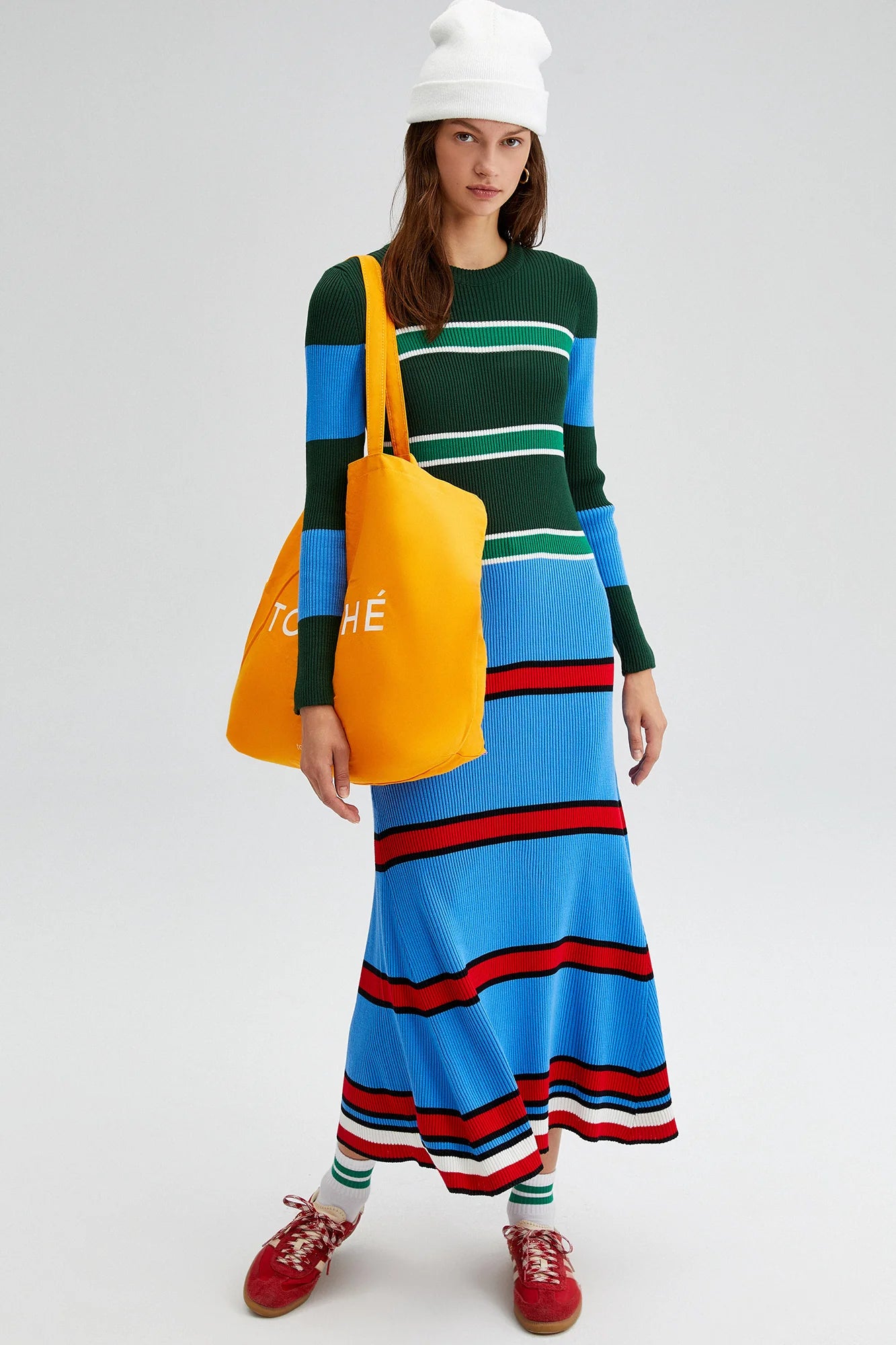 Leveillä vaakasuorilla mustilla ja luonnonvalkoisilla raidoilla varustettu rento midimekko on valmistettu pehmeästä, teksturoidusta neulosta, ja se on mukava koko päiväksi. Ylisuuri malli ja lasketut olkapäät luovat rennon tunnelman, kun taas pitkät hihat ja pyöreä pääntie tekevät siitä mukavan ja monipuolisen. Täydellinen rentoon arkeen tai yhdistettynä saappaisiin tai lenkkareihin modernia ilmettä varten.