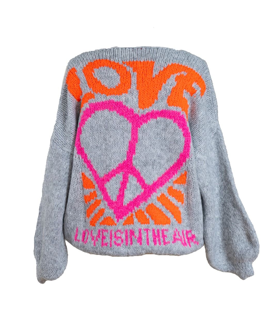 Neule, jonka selässä love-teksti (love, love is in the air).