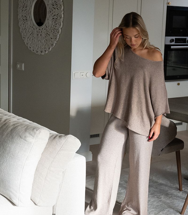 Beige neuleasu joka yhdistää vertaansa vailla olevan mukavuuden ja tyylin. Neuleasun pinta on silkkisen sileä, ihanan kevyt ja samalla lämmittävä.
