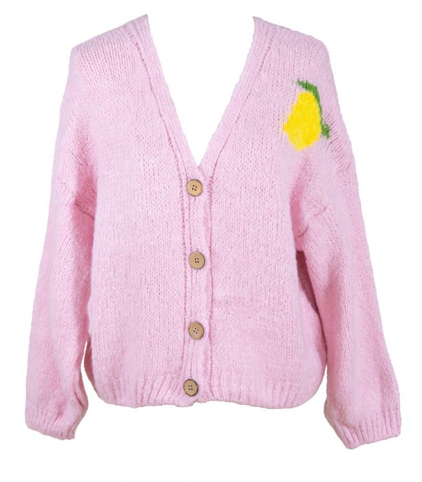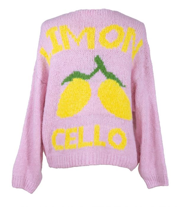 Yhden koon vaaleanpunainen neuletakki jonka etuosaa koristaa sitruunakuvio ja selkäpuolella katseenvangitsijana näyttävä limoncello teksti ja pirteät sitruunat. Neuletakki on valmistettu sekoitteesta jossa mohair ja villa tuovat lämpöä ja pehmeyttä kun taas akryyli ja polyamidi tuovat neuleeseen keveyttä. Miellyttävästi laskeutuva ja lämmin neule tuntuu mukavalta päällä ympäri vuoden.