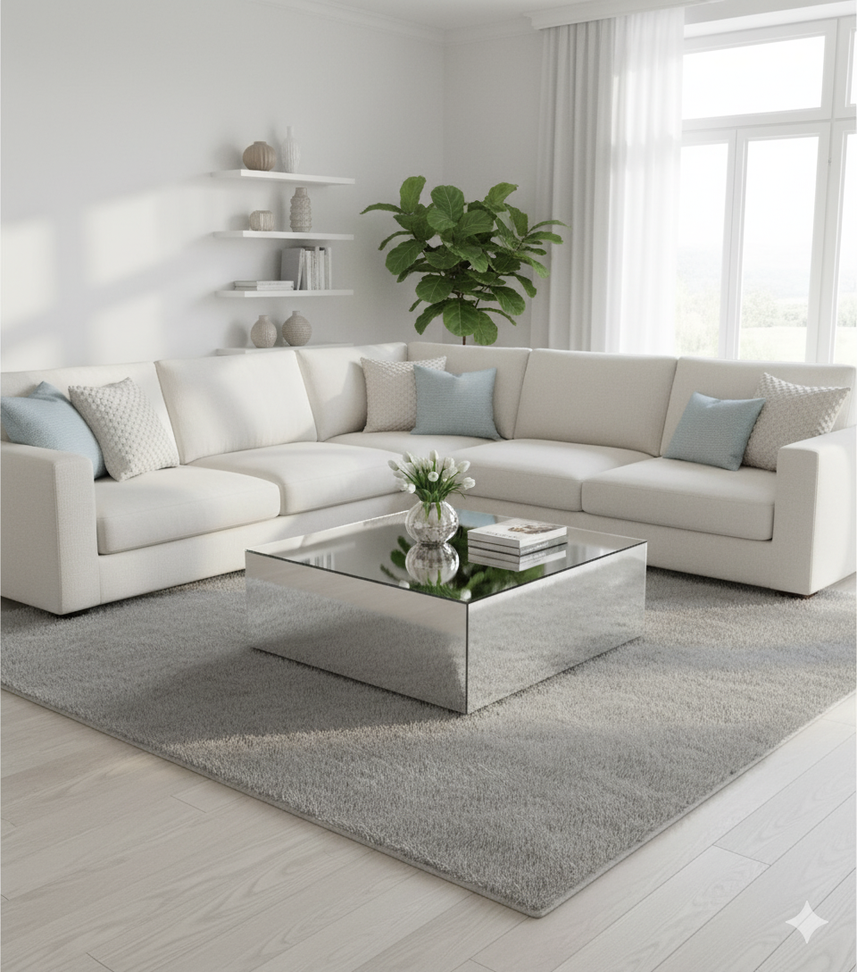 Pöytä on valmistettu korkealaatuisesta, kestävästä peilistä, joka on huolellisesti käsitelty naarmuuntumisen estämiseksi.