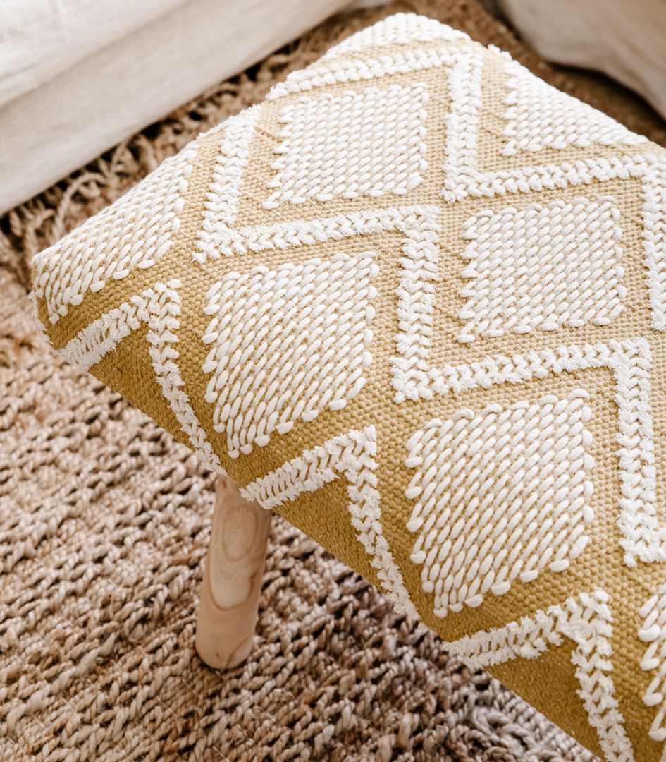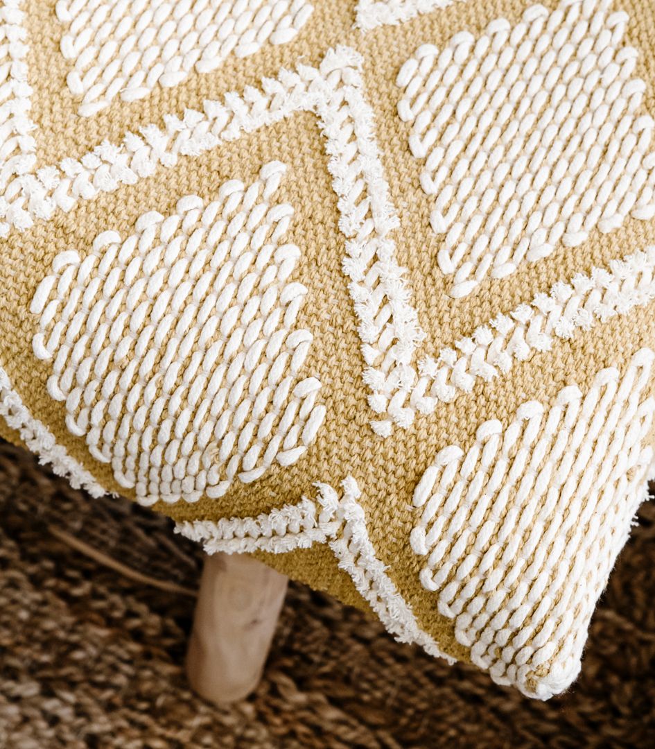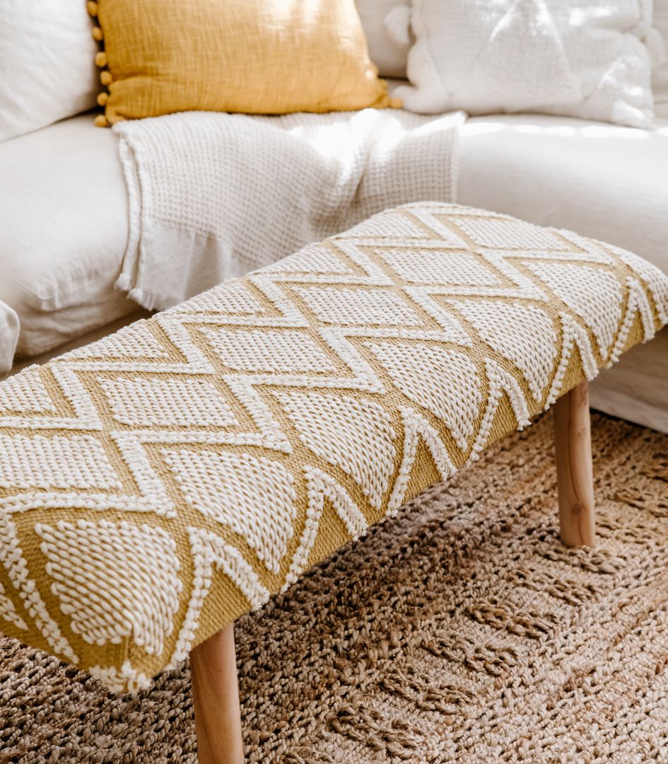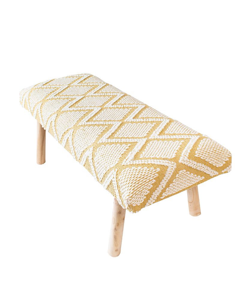 Tukeva penkki keltaisen ja valkoisen sävyisellä puuvillaisella päällisellä ja puujaloilla.