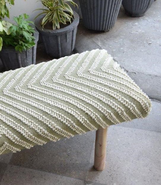 Tukeva penkki vihreän ja valkoisen sävyisellä puuvillaisella päällisellä ja puujaloilla.