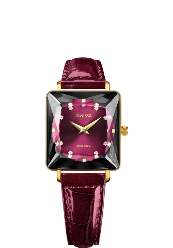 Tämä viininpunainen naisten korukello juhlistaa väriä, vahvoja linjoja ja klassista prinsessahiontaista kristallia. Musta 25 mm:n kotelo tyylikkäällä neliönmuotoisella muotoilulla kätkee sisäänsä viininpunaisen pyöreän kellotaulun, joka luo rohkean kaksivärisen ilmeen. Kiiltävä viininpunainen nahkaranneke viimeistelee ilmeen. Sveitsiläinen kvartsikoneisto tekee siitä luotettavan kellon.