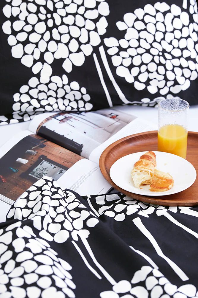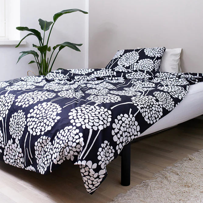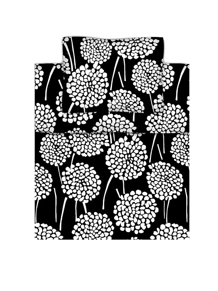 Näyttävä musta-valkoinen Daaliat kuosin pussilakanasetti. Pussilakanan koko 150 x 210 cm ja tyynyliinan koko 50 x 60 cm.