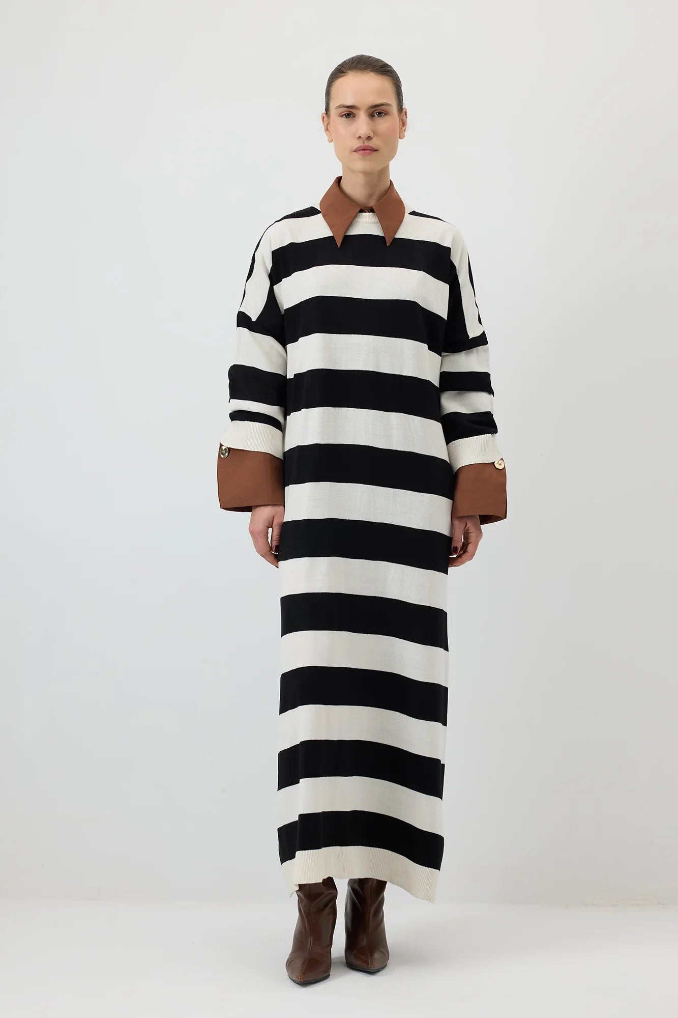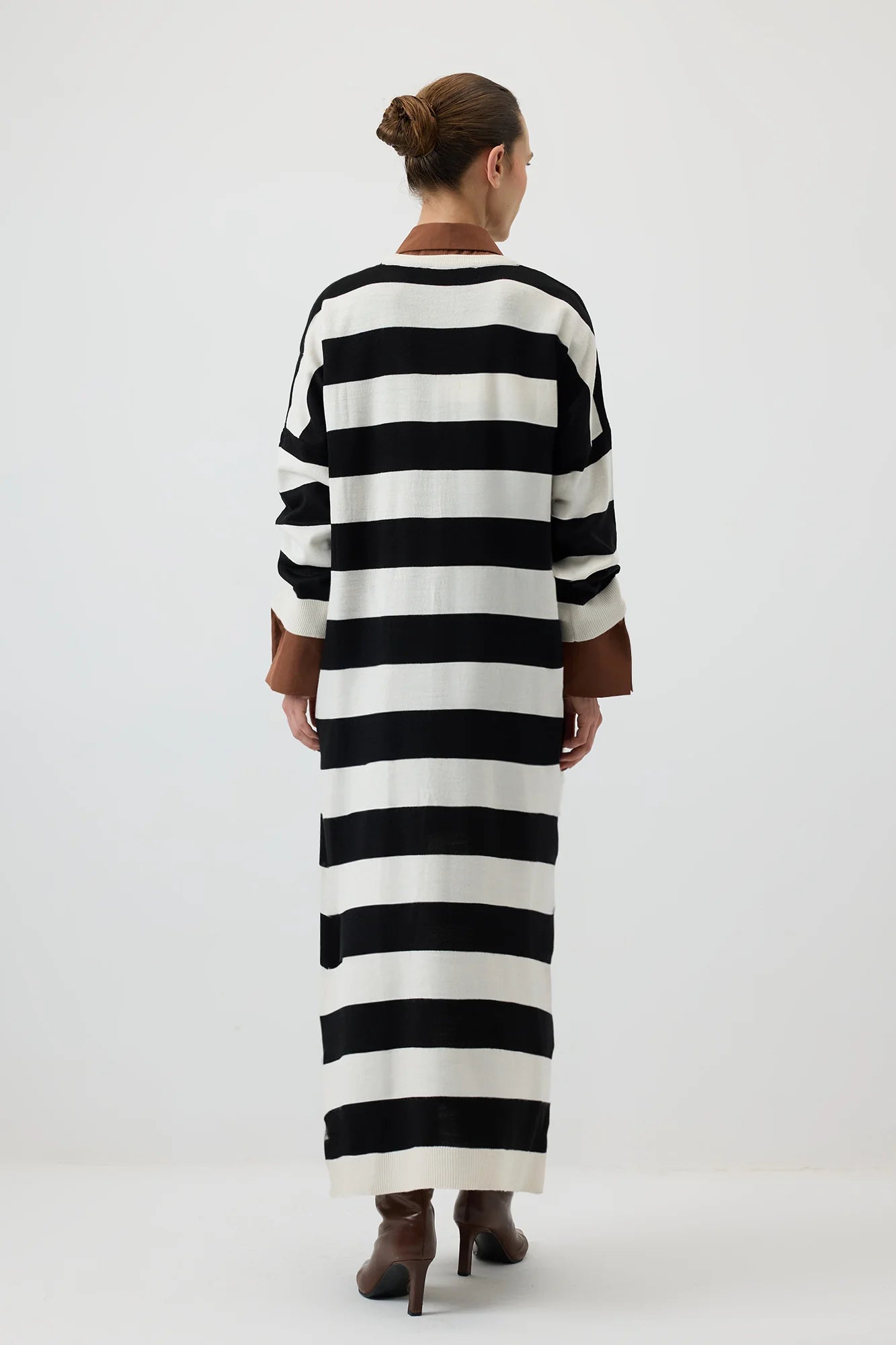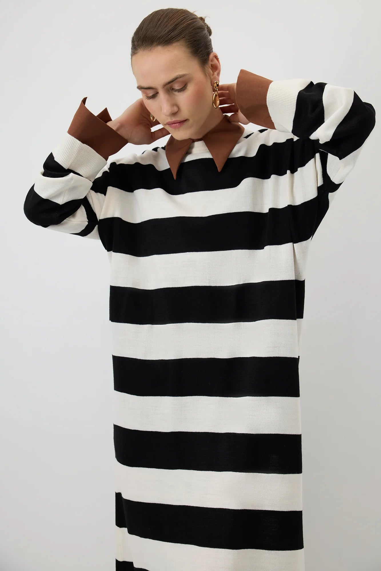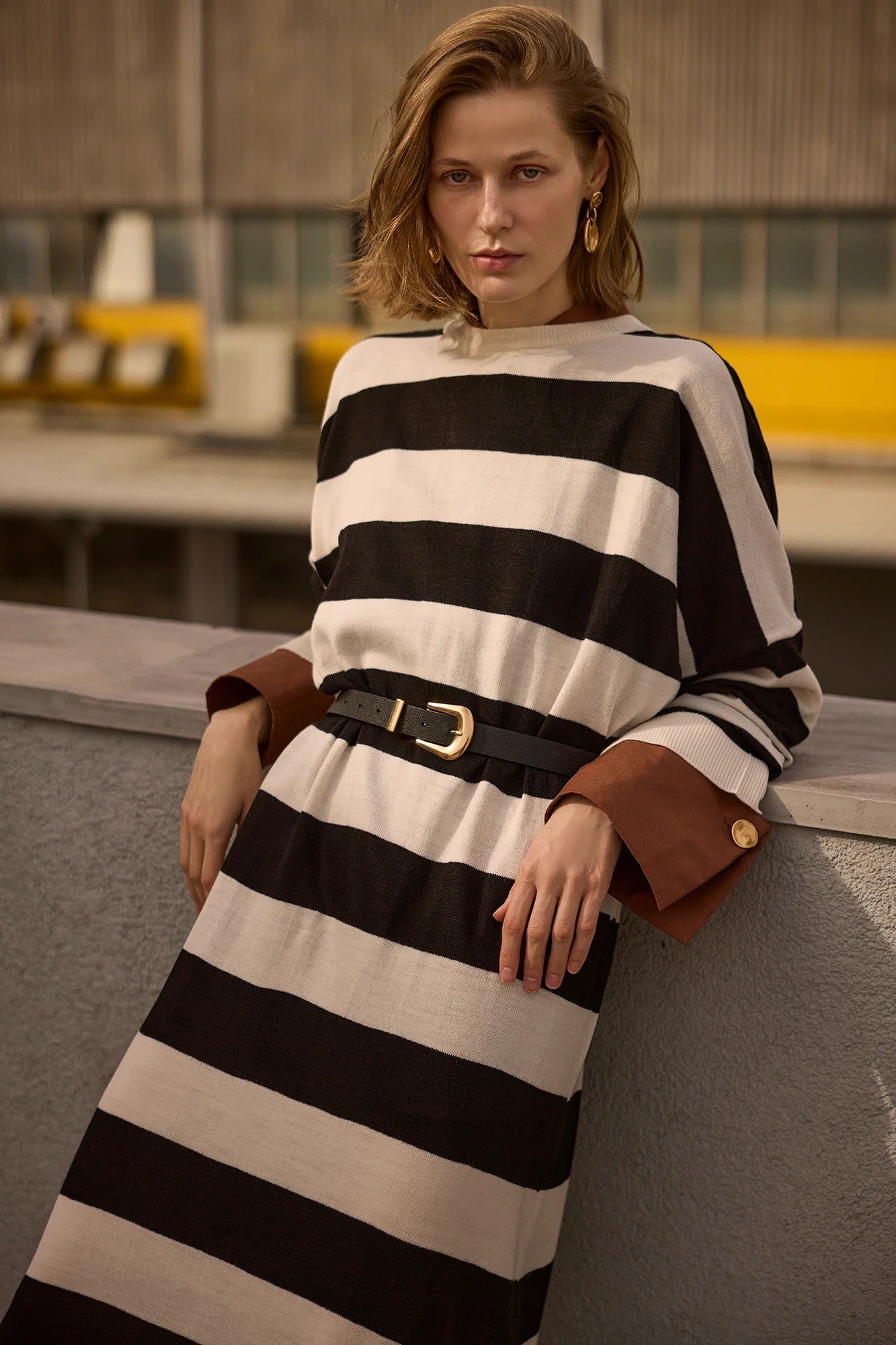 Leveillä vaakasuorilla mustilla ja luonnonvalkoisilla raidoilla varustettu rento midimekko on valmistettu pehmeästä, teksturoidusta neulosta, ja se on mukava koko päiväksi. Ylisuuri malli ja lasketut olkapäät luovat rennon tunnelman, kun taas pitkät hihat ja pyöreä pääntie tekevät siitä mukavan ja monipuolisen. Täydellinen rentoon arkeen tai yhdistettynä saappaisiin tai lenkkareihin modernia ilmettä varten.