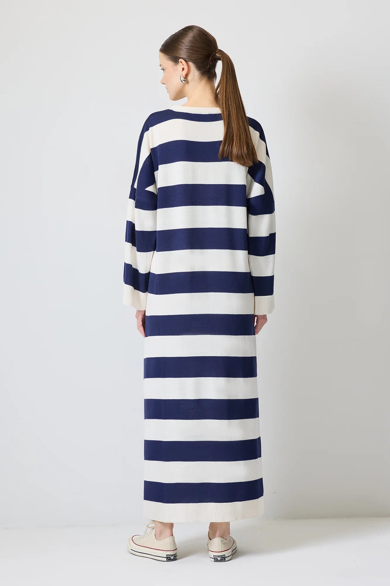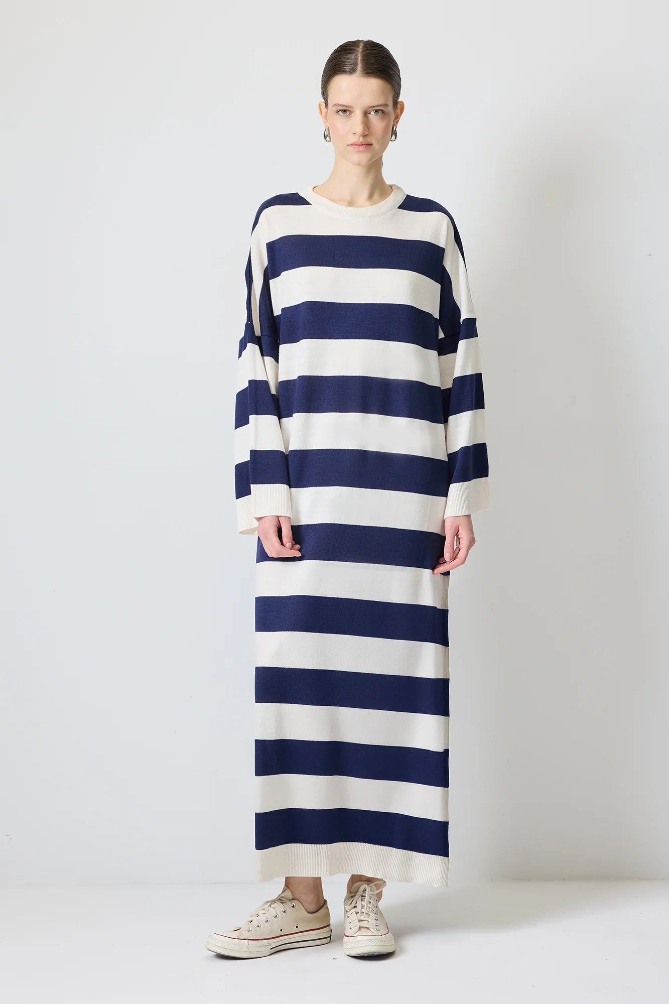 Leveillä vaakasuorilla mustilla ja luonnonvalkoisilla raidoilla varustettu rento midimekko on valmistettu pehmeästä, teksturoidusta neulosta, ja se on mukava koko päiväksi. Ylisuuri malli ja lasketut olkapäät luovat rennon tunnelman, kun taas pitkät hihat ja pyöreä pääntie tekevät siitä mukavan ja monipuolisen. Täydellinen rentoon arkeen tai yhdistettynä saappaisiin tai lenkkareihin modernia ilmettä varten.
