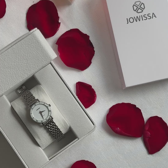 Tämä klassinen kello tuo modernia eleganssia naisten design-kelloihin. Sveitsissä valmistettu ja kauniista Rooman kaupungista inspiraationsa saanut Roma-hopeanaistenkello on varustettu tukevalla, ruostumattomasta teräksestä valmistetulla hopeisella rannekkeella ja klassisilla mustilla roomalaisilla numeroilla, jotka erottuvat silmiinpistävässä valkoisessa 26 mm halkaisijaltaan olevassa kuoressa.