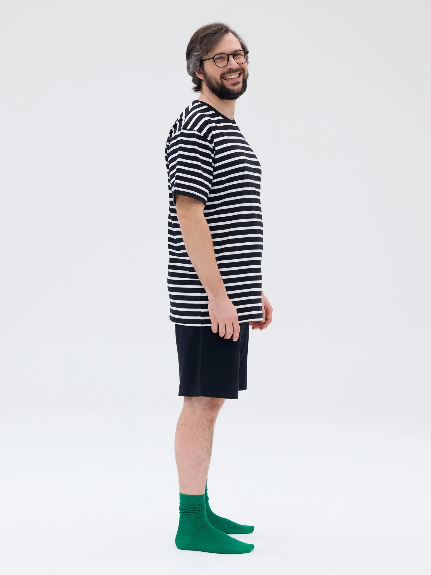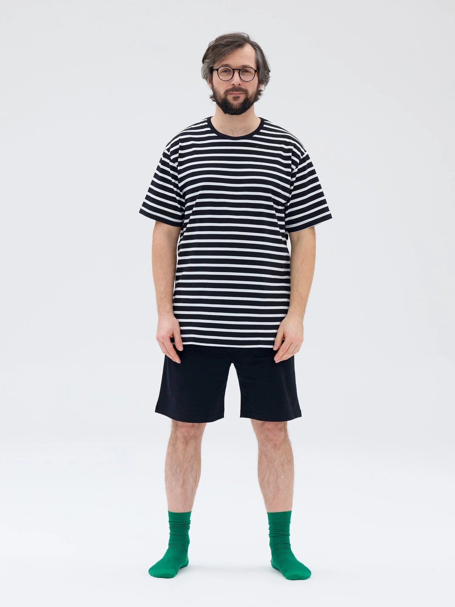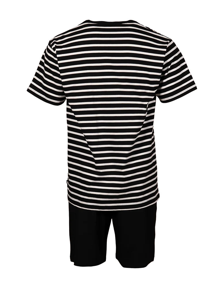 Miesten shortsipyjama. Musta/valkoinen raidallinen paita ja yksiväriset, mustat shortsit. Pyöreä pääntie, lyhythihainen t-paita ja shortsi alaosa. Raidan leveys 18 x 9 mm. Pyjama on valmistettu laadukkaasta 100 % luomupuuvillasta, joka on mukavan ohutta, iholla pehmeää ja hengittävää materiaalia.
