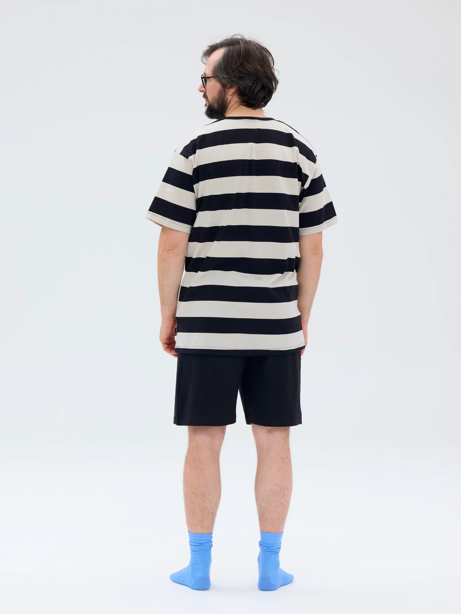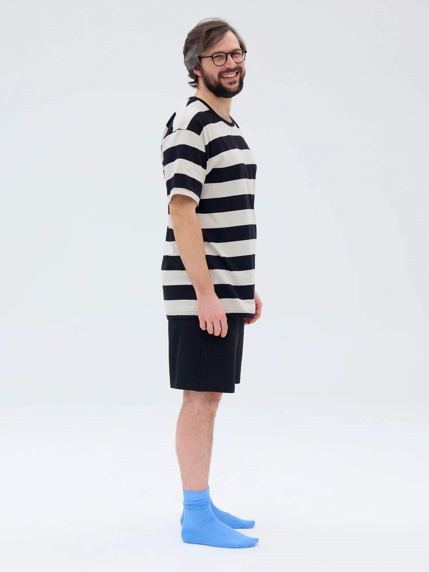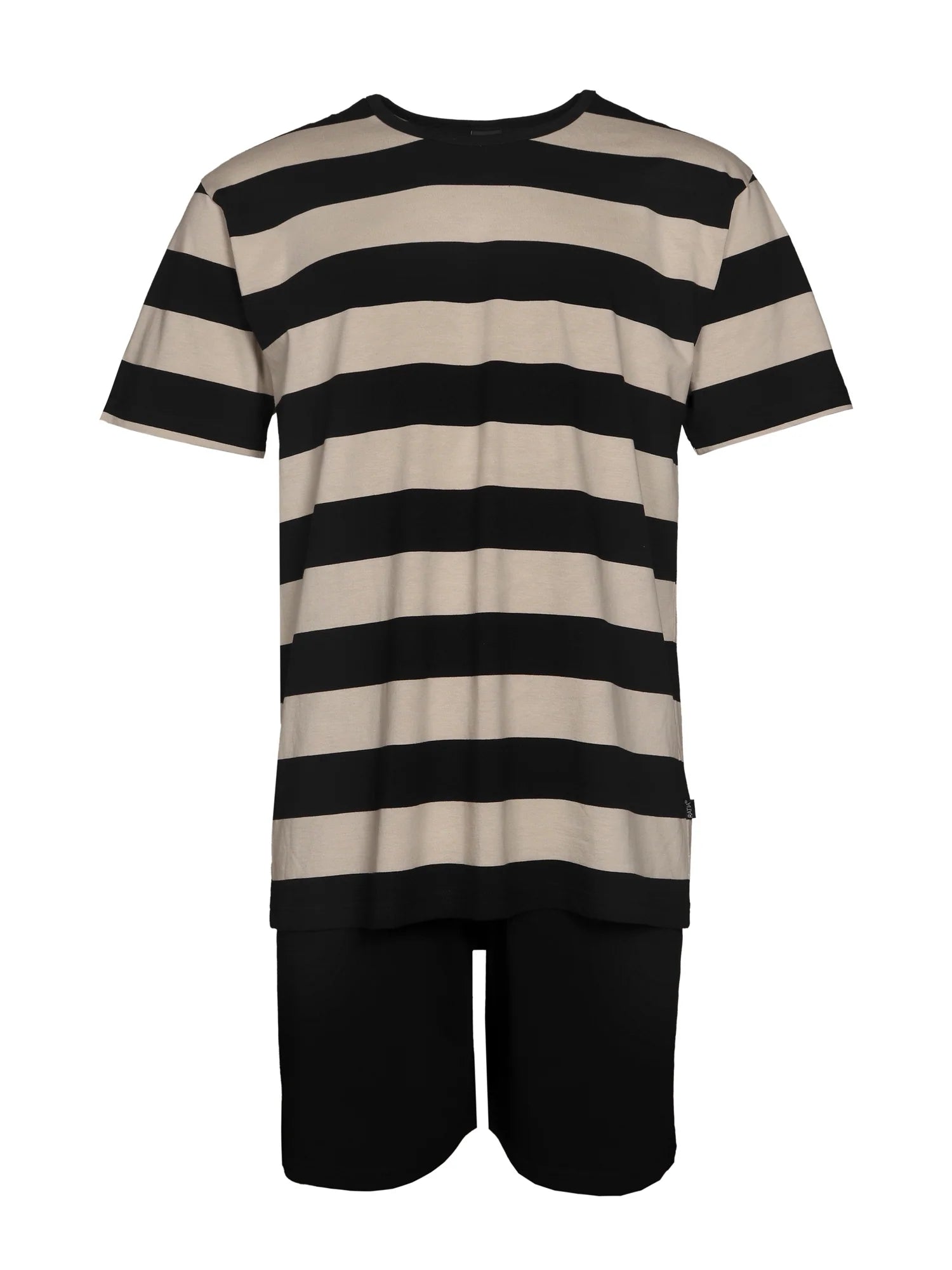 Miesten shortsipyjama. Musta-hiekka raidallinen paita ja yksiväriset, mustat shortsit. Pyöreä pääntie, lyhythihainen t-paita ja shortsi alaosa kuminauhavyötäröllä. Raidan leveys 50 mm. Pyjama on valmistettu laadukkaasta 100 % luomupuuvillasta, joka on mukavan ohutta, iholla pehmeää ja hengittävää materiaalia.