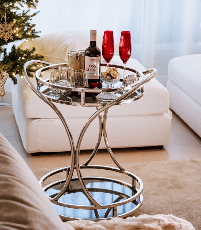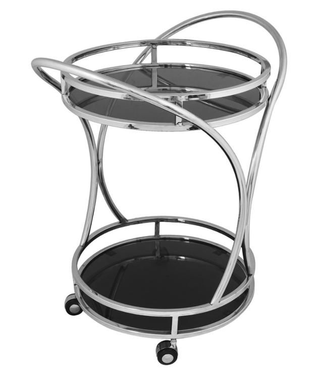 Klassiseen ja moderniin sisustukseen sopiva jossa kromia ja mustaa lasia.