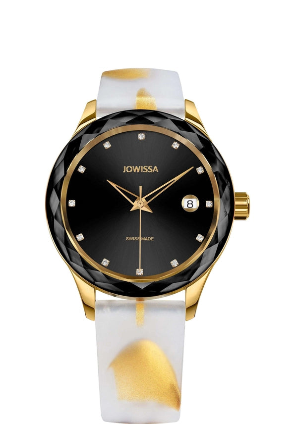 Tämä upea sveitsiläinen musta kello yhdistää minimalismin ripaukseen kimallusta ja glamouria. Siinä on reilun kokoinen 38 mm:n kuori, joka herättää katseen, ja mustaa kellotaulua korostavat lämpimän kultaiset yksityiskohdat viisareissa ja hienovaraiset strasseja sisältävät tunti-indikaattorit. Läpinäkyvä ja sileä silikoniranneke, jossa on ainutlaatuinen kultainen kuvio, tuo lisäykseen ylellisyyttä. Selän logokuvio varmistaa paremman ilmankierron ja lisää käyttömukavuutta.