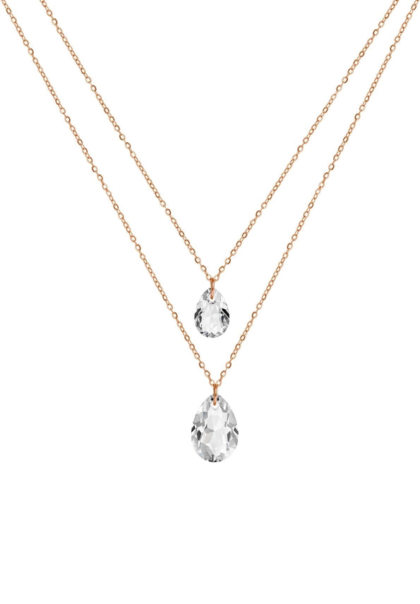 Kaksiosainen kaulakoru, jossa upeasti leikatut Sveitsiläiset kristallit, ruusukullatuissa ketjuissa.