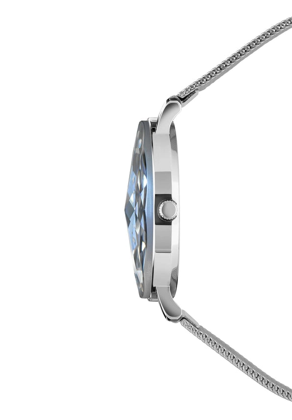 Tämä viileän sininen naistenkello tuo tyyliä ja väriä ranteeseesi. Se näyttää kauniilta hiotun lasin ja helmiäishohtoisen kellotaulun ansiosta. Sinisen hohteen lisäksi korkeakiiltoinen 35 mm:n kuori sopii hyvin yhteen hopeisen verkkorannekkeen kanssa. Tämä kimalteleva koru sopii hienostuneeseen tyyliisi.