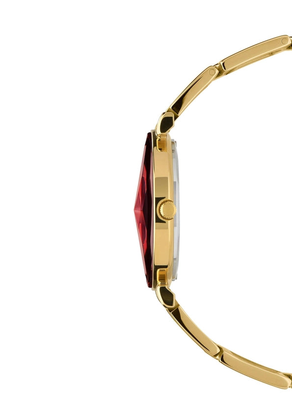 Eloisaa väriloistoa huokuvassa Facet Swiss -naistenkellossa on 30 mm:n runko, kauniisti hiottu kristalli kiiltävine yksityiskohtineen ja ylellinen viininpunainen auringonsäteiden kellotaulu. Lisäksi siinä on tyylikäs ruostumattomasta teräksestä valmistettu tikapuuranneke, joka istuu mukavasti ranteeseen.