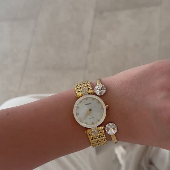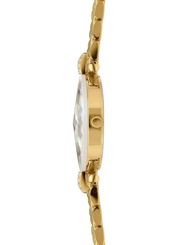 Viistehiottu strassi tuo raikasta tyyliä klassiseen naisten kultakelloon silmiinpistävällä valkoisella helmiäiskellotaululla ja 30 mm:n halkaisijalla. Kimaltelevat strassit merkitsevät tunnit, ja viistehiottu lasi lisää hienostunutta ilmettä. Kultainen verkkoranneke täydentää tämän ylellisen ilmeen. Ajan ja korun juhla yhdessä.