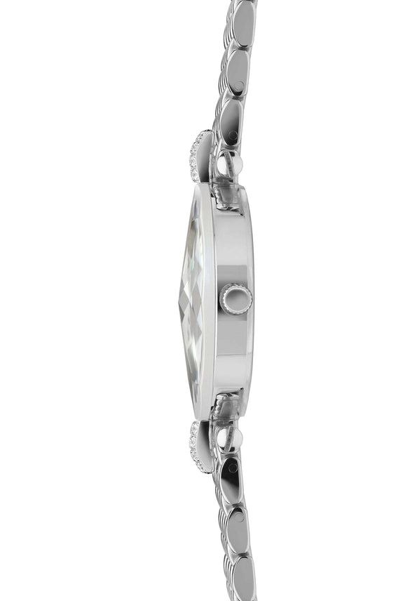 Tämä sveitsiläisvalmisteinen hopeinen kello, jonka klassisen halkaisijan omaava kello on 30 mm, tuo ranteeseesi lisää kimallusta. Siinä on upea valkoinen helmiäiskuvioinen kellotaulu, jota koristavat kimaltelevat strassit ja hopeinen verkkoranneke, jotka antavat sille korullisen ilmeen ja tuntuman. Tämä trendikäs kello on tähtien vetonaula ja kääntää katseita minne ikinä menetkin.