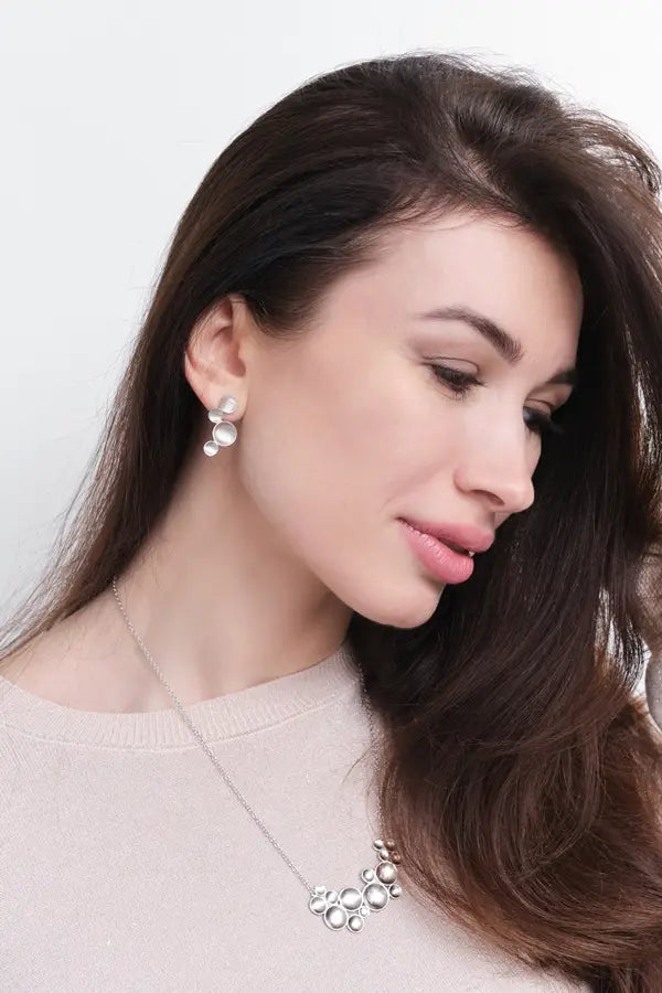 Werla Midi-korvakoruissa erimuotoisten pallojen muodostama kokonaisuus laskeutuu kauniisti korvanlehden alapuolelle kuin kevyt saippuakuplarivi. Korvakorun korkeus on 27 mm ja leveys 11 mm. Korvakoruissa on kätevä nappilukitus.