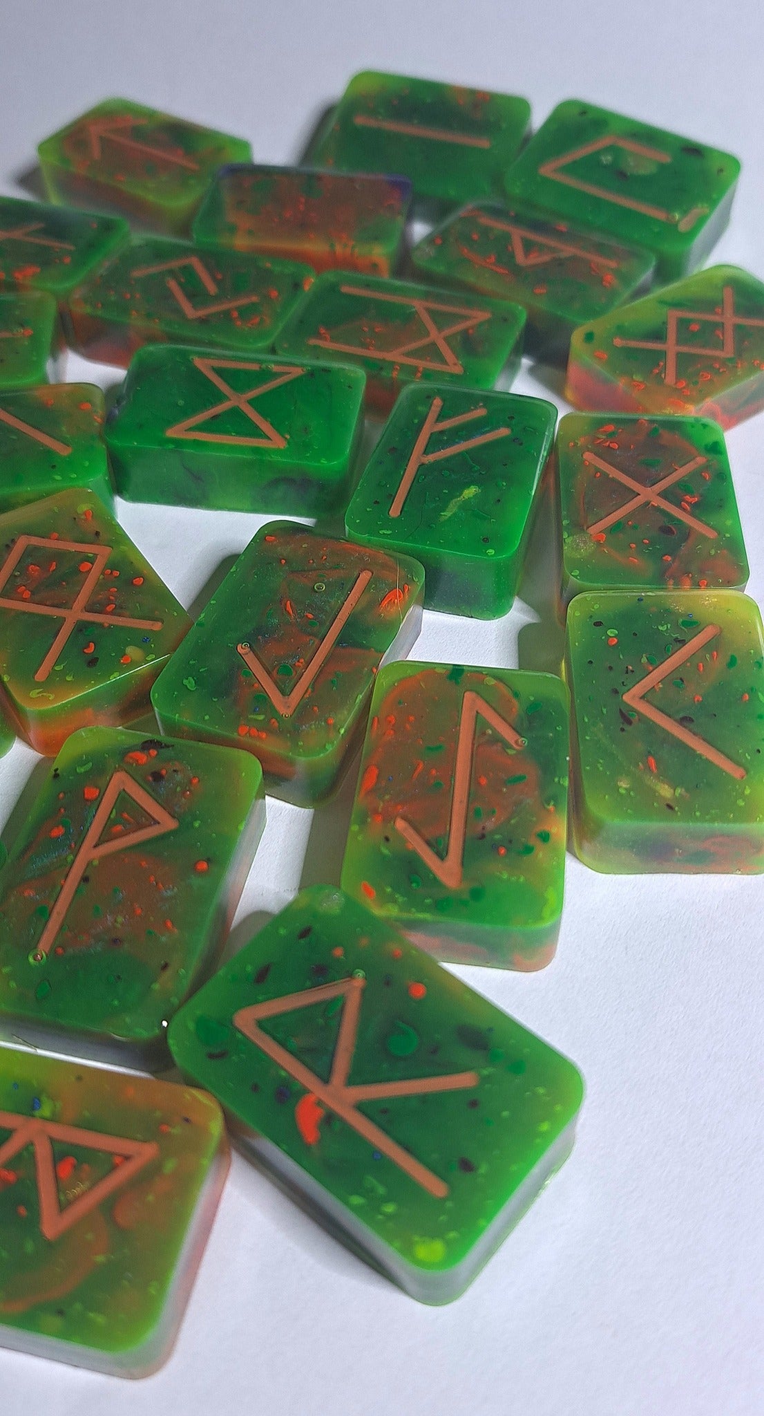 Nämä riimut on valmistettu epoksista, joiden sekaan on intuitiivisesti lisätty omanlaisensa kädenjälki ja sävyineen luotu omanlainen merkityksensä. Jokainen riimu on yksilöllinen, eikä toista vastaavaa löydy muualta.